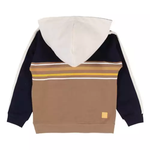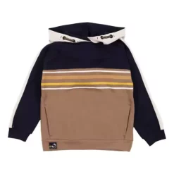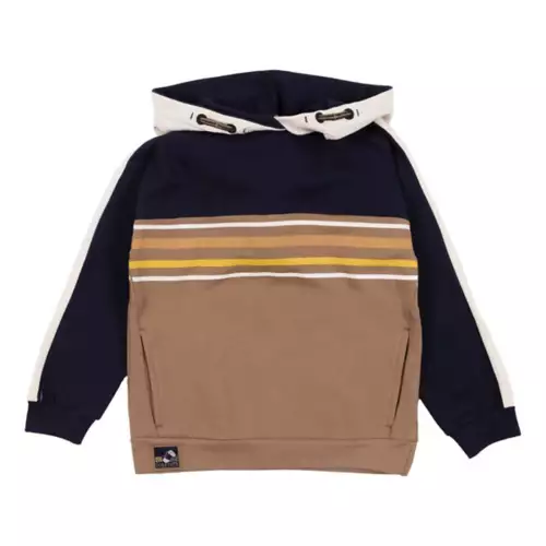 Color-block fleece hoodie. Drop-shoulder long sleeves. Style with side pockets and chest print.