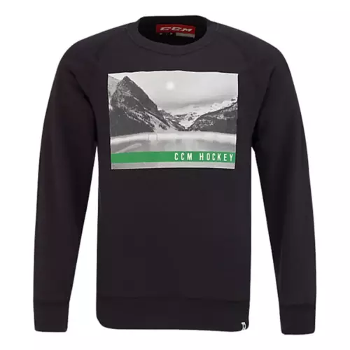 Opt for this long-sleeved CCM crewneck sweatshirt sporting a photo of the greatest pond hockey in the world, Lake Louise. With its ribbed cuffs and waistband, this fleece crew offers an extremely comfortable fit while you day dream of ODR.
