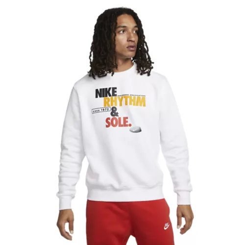 The Men’s Nike Sportswear Fleece Crewneck Sweatshirt is a great choice for everyday wear. Made from cotton and polyester, the Nike Sportswear Fleece Crewneck Sweatshirt is super soft and durable, while the brushed interior provides plenty of warmth. With the rhythm and sole graphics, you’ll be reminded to feel the groove and move your feet. With stretchy ribbed wrist cuffs and hem, you’ll enjoy the comfortable fit and feel too.
