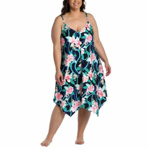 Destination paradise. The beautiful blooms set against a black background on this cover-up bring to mind a moonlit stroll along a sandy beach. Lingerie straps and a V-neck facilitate easy ons and offs for throw-on-and-go ease. Flattering on most body types, the asymmetrical handkerchief hem gives this dress an easy, breezy vibe.
