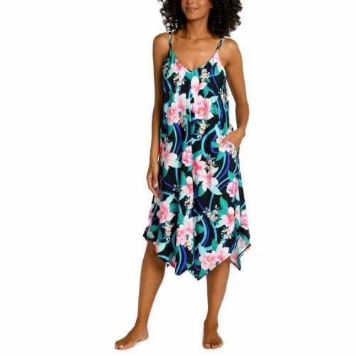 Destination paradise. The beautiful blooms set against a black background on this cover-up bring to mind a moonlit stroll along a sandy beach. Lingerie straps and a V-neck facilitate easy ons and offs for throw-on-and-go ease. Flattering on most body types, the asymmetrical handkerchief hem gives this dress an easy, breezy vibe.