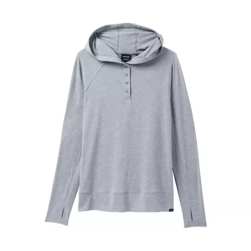 Recycled poly stretch knit melange jersey with UPF 50+ • Fabric weight: 150 gsm • Long sleeve raglan henley with snap front with hood • On-seam thumb holes • Banded hem • Standard Fit