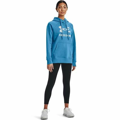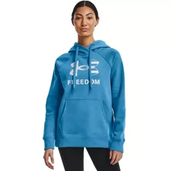 The Women’s Under Armour Freedom Rival Hoodie will soon become your favorite go-to comfy layer. Made from a cotton and polyester blend, the Under Armour Freedom Rival Hoodie is super soft, warm, and durable, while the larger Under Armour logo with an American flag pattern provides an athletic style. The ribbed cuffs and hem provide a better fit, and the raglan sleeves enhance shoulder mobility. Whether you’re lounging around the house or out running errands, wear the Women’s Under Armour Freedom Rival Hoodie.